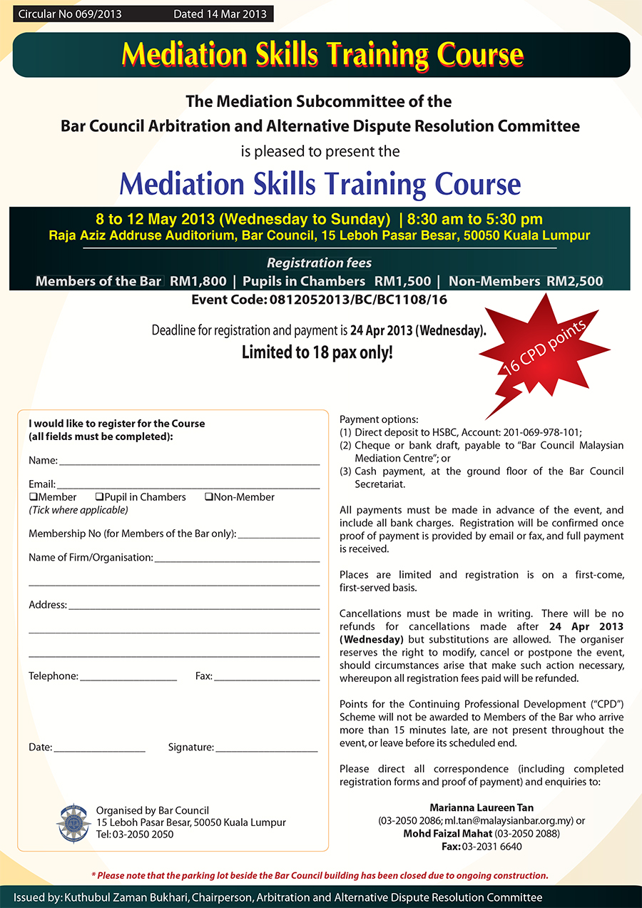 Mediation Skills Training (Singapore) CEDR Mediator Accreditation Course 25th, 26th, 28th, 29th and 30th April 2014 Mediator skills training This is a five-day programme of comprehensive tuition in effective dispute ... View Doc
